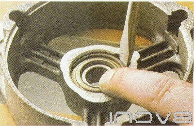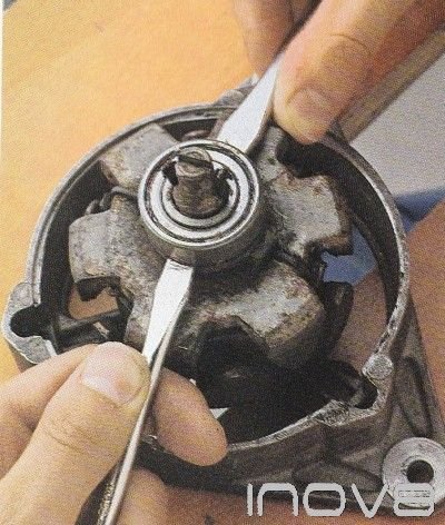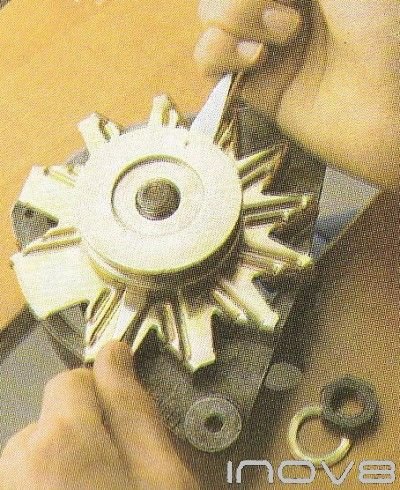 To change the rear bearing, separate the two casings of the alternator and remove the slip ring Then using two screwdrivers carefully try to lever the bearing off the rotor shaft (fig 1). If it is very tight you will have to use a bearing puller to remove it or have it removed by an auto electrician. Fit the new barn by tapping it into place on the rotor shaft using a socket as a drift (fig 2). Refit the slip ring and reassemble the alternator