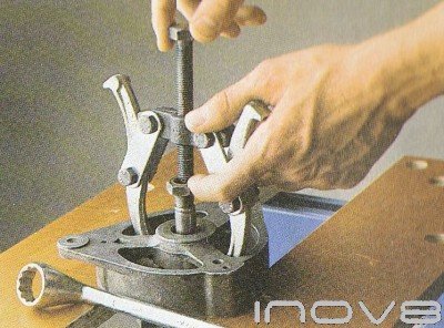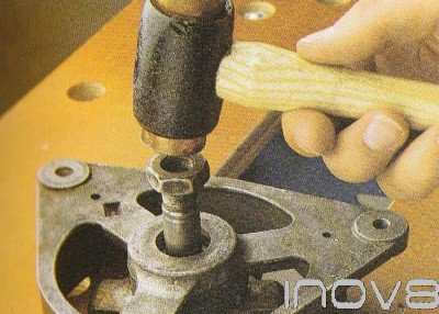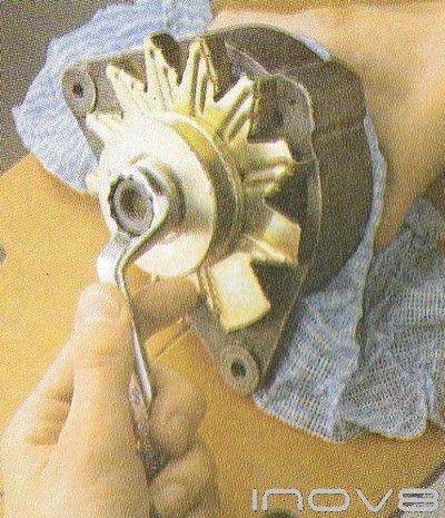 With the Woodruff key. Position the front bracket on the edge of a sturdy table or workbench Make sure the rotor is not fouling on the edge of the bench and then put the pully nut back on the end of the shaft, with a copper or hide- headed mallet drive the rotor out of the front bracket (fig 5). If the rotor shows no sign of moving do not carry on hitting the end of the shaft - all you will do is damage the nut and the threads. Instead use a two- or three-legged puller on the end of the shaft to’ pull the front racket from the rotor assembly (fig 6). With the legs of the puller in place hold on to the rotor and tighten up the nuts or bolts on the puller, making sure it does not slip off.