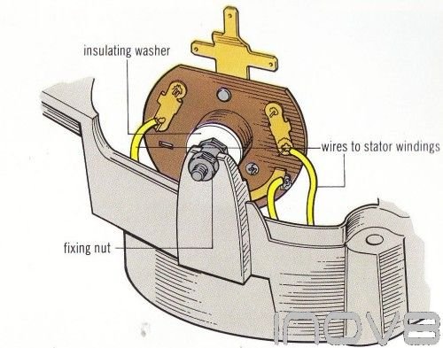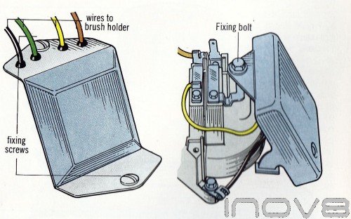 The only alternator with an internal regulator which can be easily dismantled the Lucas ACR type, -The regulator is a sealed transistorized unit so it cannot be repaired if it is faulty you will need a new one, There are several different types of regulator and it is best to take the old one to your dealer to make sure you get the right one, If the original type of regulator is not available your dealer will be able to offer an alternative type which will fit, To remove the regulator, first undo the slip ring cover and find the regulator screws. Some models have two screw one to the alternator body and one to the brush holder (fig 1) - others are held by one screw on to the brush holder (fig I), Draw a diagram of the regulator connections and then remove them. Undo the screws and lift the regulator away, Fit the new regulator into place and reconnect all the leads. finally refit the slip ring cover.
