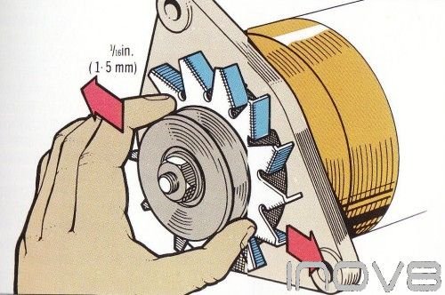 An alternator which is noisy in operation usually has worn bearings. If the noise is only slight then it is probably not worth doing anything about, but a loud rattling or ‘graunching' nose should not be ignored. To check the front bearing for wear, hold the alternator firmly and spin the pulley - it should rotate smoothly, any roughness or grinding noise means that the bearing is worn. Also try to rock the pulley from side to side (fig 1) - very slight movement is acceptable, so long as the bearing does not sound rough but if the play is more than 1/16 in, (1,5 mm) then the bearing must be replaced the rear bearing is more difficult to check as the alternator casings have to be separated (see Step 4) to get at it. Once you have separated the alternator casings, check the bearing by spinning it. It should not feel rough or make a grinding noise in practice the rear bearing seldom wears as it. has very little load, unlike the front bearing and is well protected from dirt by the alternator casing,