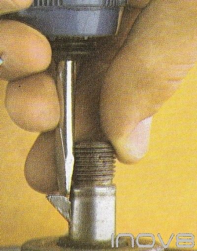 The brush nearest the centre should have a small flat spring fitted along- side it. Check the length of the brushes (fig 6) and if they are less than 3/16 in. (5 mm) in length buy some new ones. Clean the holder with meths and then fit the new brushes into place remembering to fit the flat spring suppled with the brushes (fig 7). replace the small bolts that hold the brushes. together with any wires that were under them Now reassemble the unit.